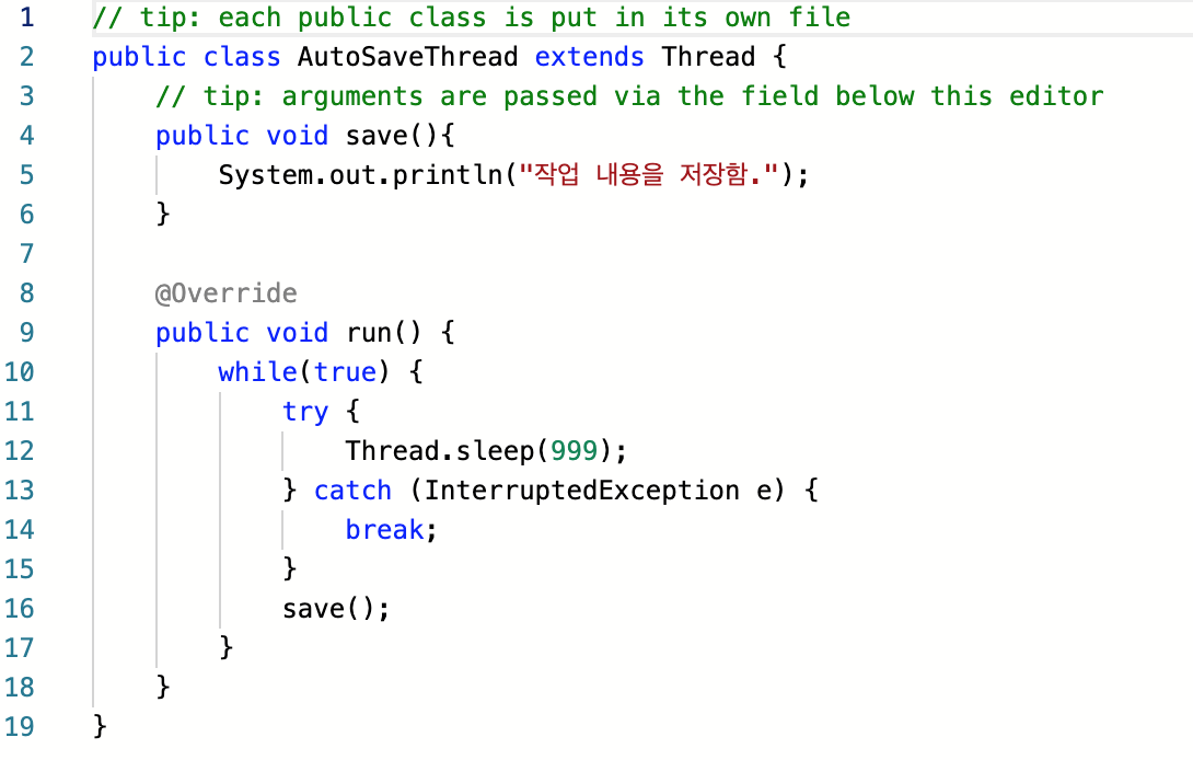 책의 예제로 쓸, AutoSaveThread라는 데몬 스레드를 생성하고 실행하는 방법은 다음과 같다.