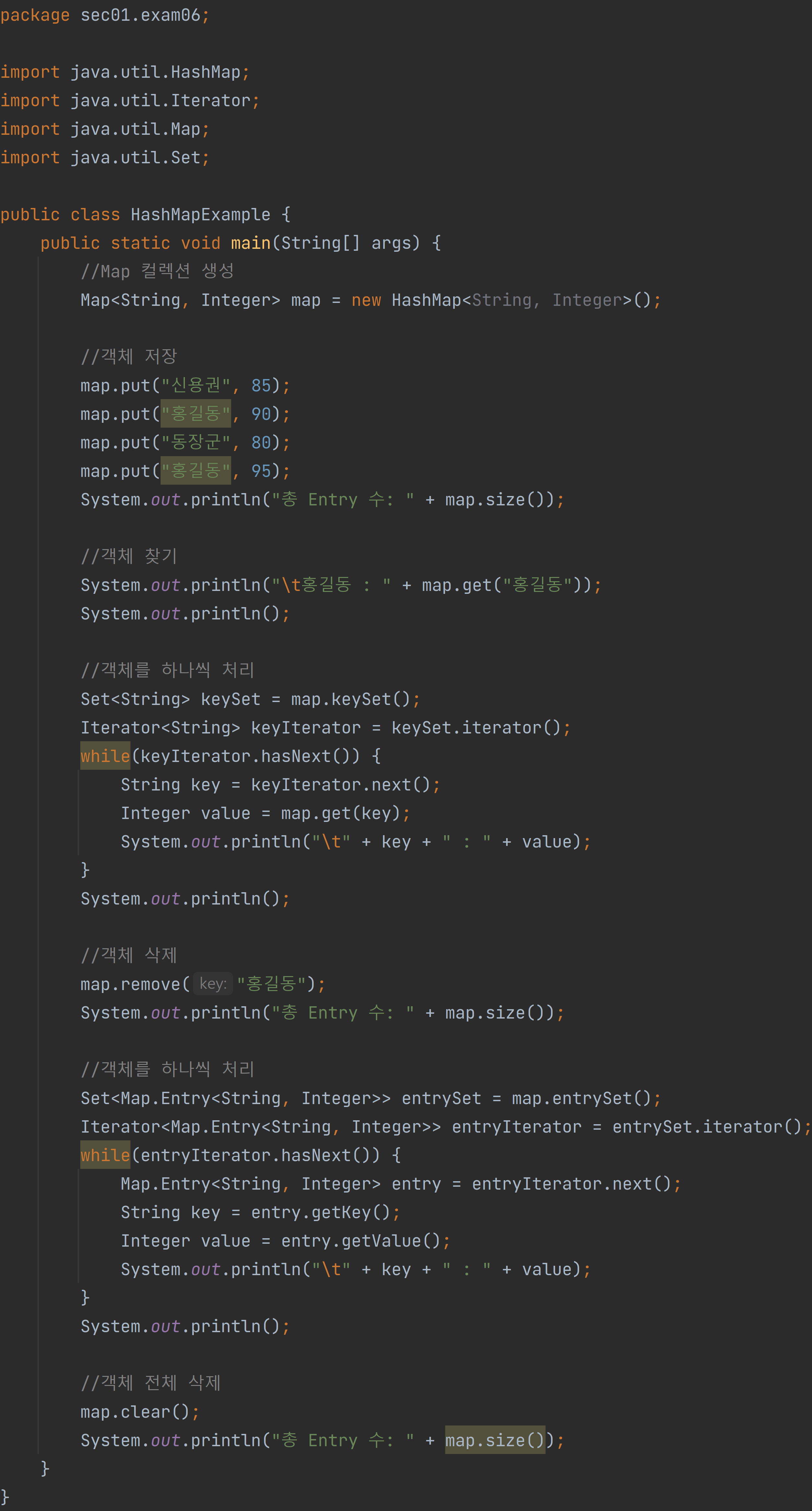 map.remove("홍길동"); // "홍길동" 키에 해당하는 Entry(키-값 쌍) 삭제