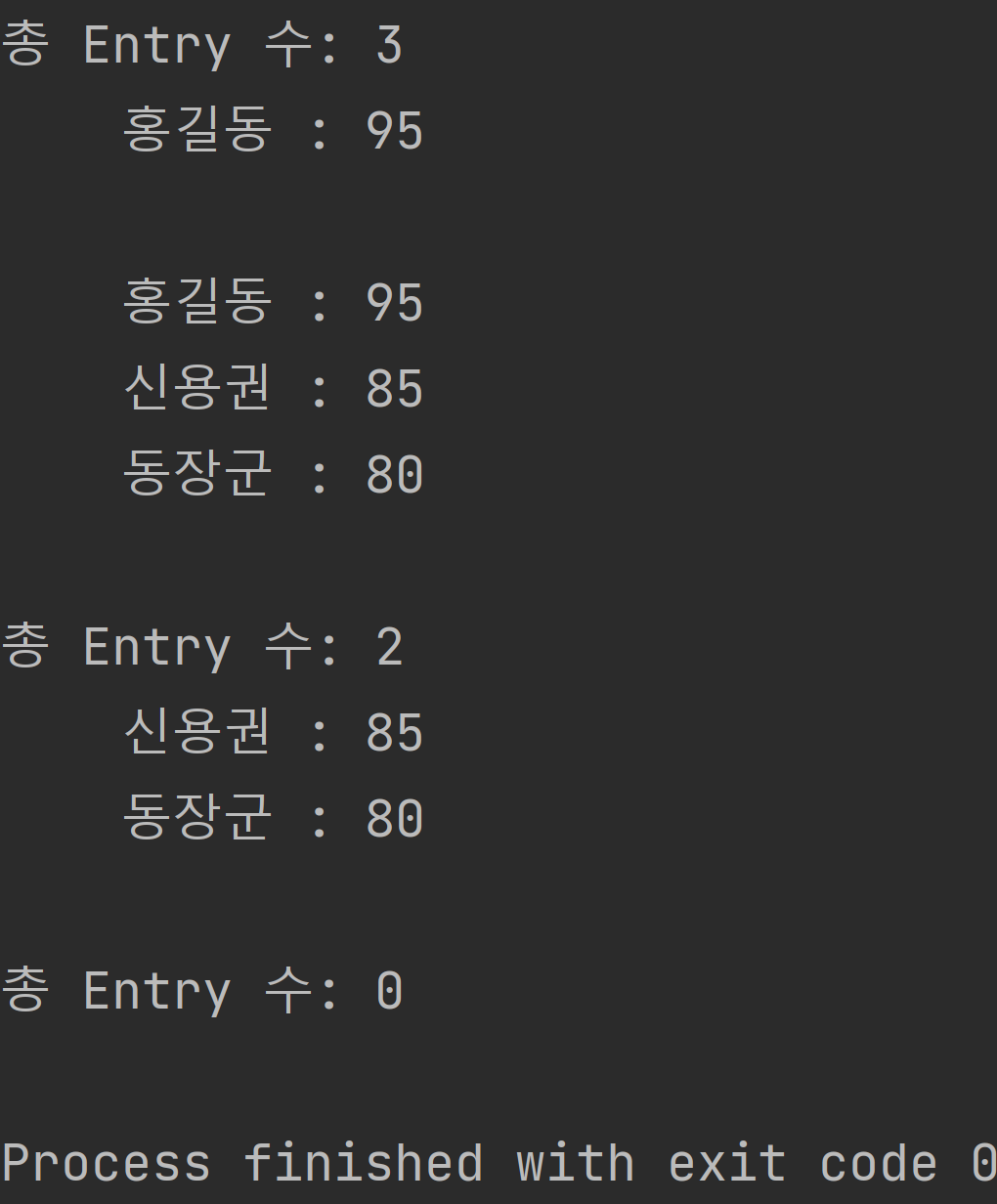 따라서 총 Entry 수는 3이고, 홍길동 : 95 값이 출력된다.