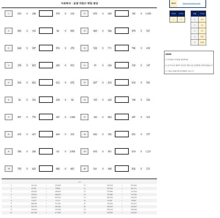 이전에 나눗셈 어림산 생성시트를 배포한 적이 있는데, 여유가 있어서 곱셈도 만들어봤다.