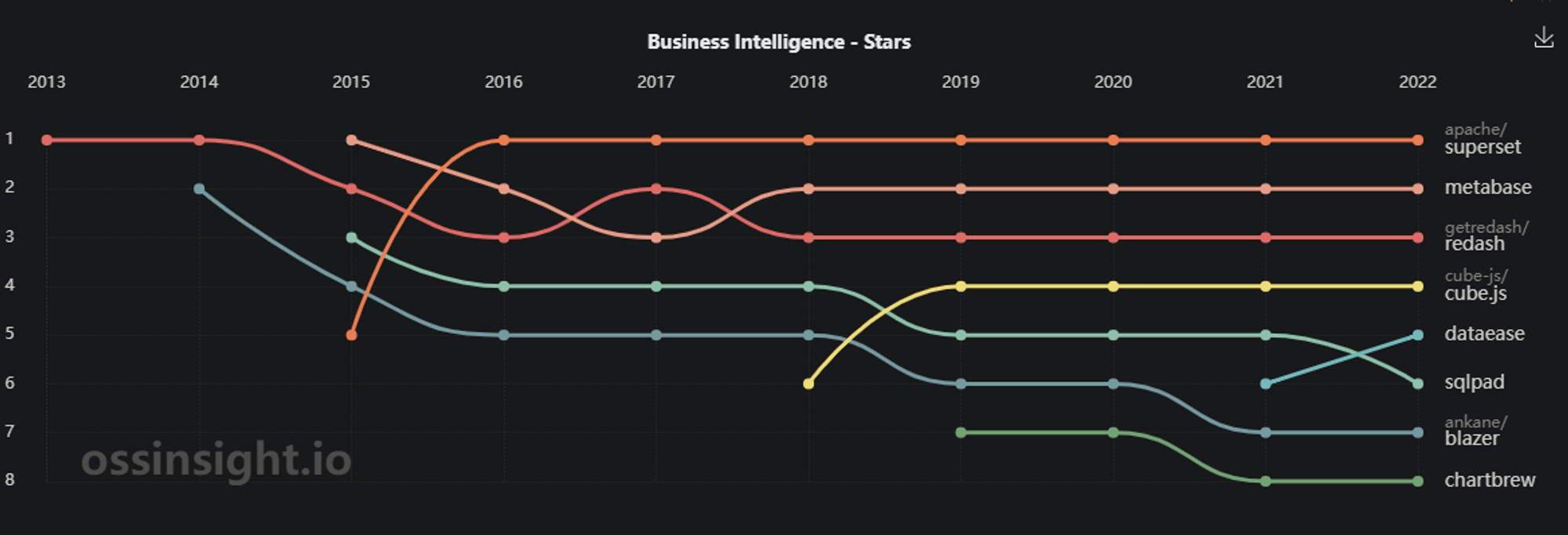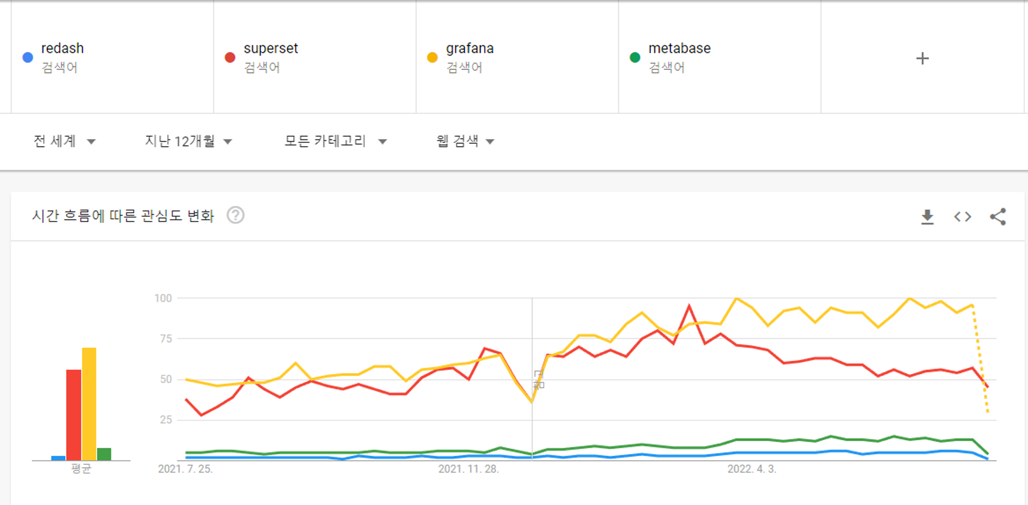 당시 화려한 시각화보다는 database 간 결합하거나, 다양한 데이터 소스를 지원하고, 알람을 쏴주는 그런 부분들이 더 필요했다. 그래서 추려낸 오픈 소스가 grafana, metabase, superset, redash 정도였다.