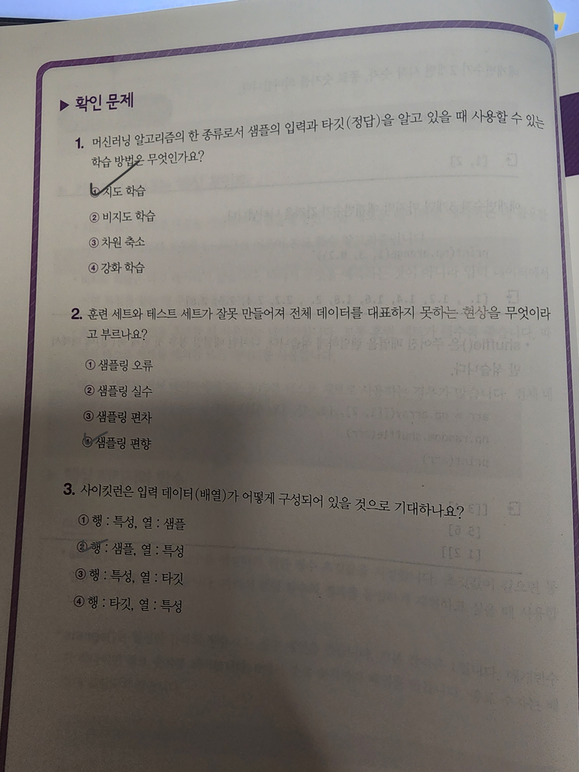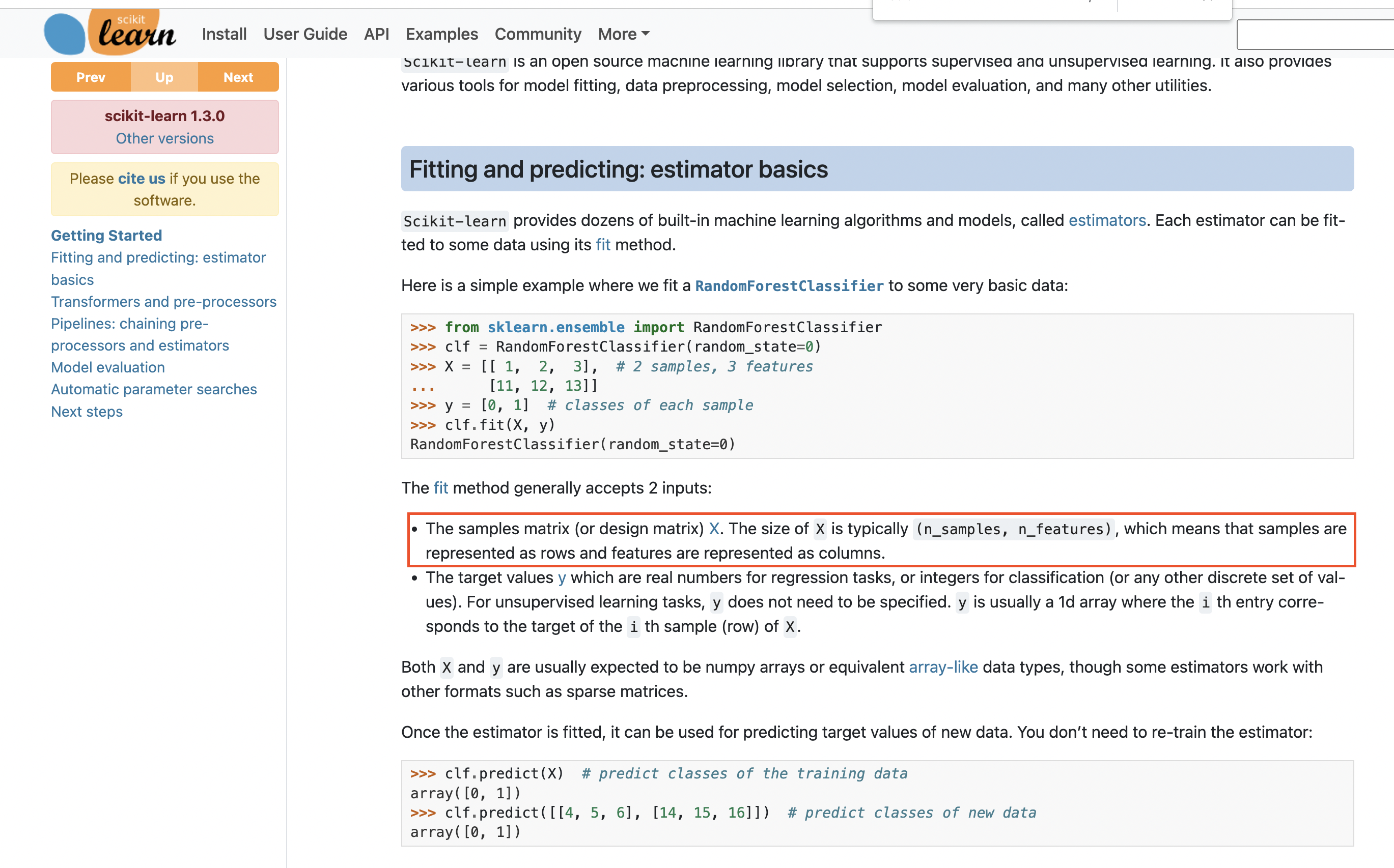 사이킷런의 일반적인 샘플행렬에 대한 설명인데 행은 샘플(표본)으로, 열은 특성으로 나타낸다는 단서를 찾을 수 있다.